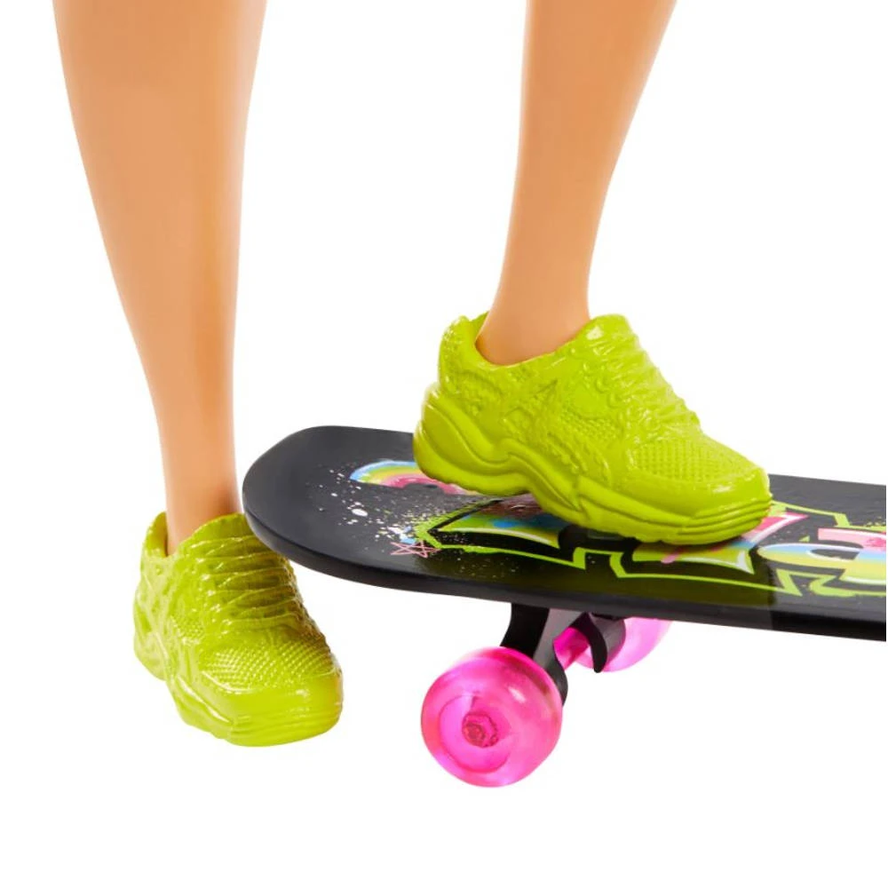 Je Barbie-verhalen speel je eenvoudig na met deze Barbie extra pop met blauw afrohaar. Deze ​Barbie heeft een meer curvy-lichaam dan de originele pop en haar haarstijl met een zee van blauwe krullen en een trendy knotje is een waar kunstwerk. De leuke en speelse look laat haar eigen zelfverzekerde stijl zien. Ze draagt een tie-dye topje en witte shorts met daaroverheen een blauw bomberjack met oranje voering en een echt werkende rits. De accessoires van ​Barbie zijn een skateboard met Malibu-print en roze wielen, een neongroen heuptasje, een zilverkleurige zonnebril, ‘Girl Power’ oorbellen, een hoofdtelefoon en neongroene sneakers. Deze maken haar look extra persoonlijk. De twee witte kittens met hun gouden kroontje en die guitige uitdrukking op hun snuitje zijn ook superschattig. Maar wat nóg leuker is, ze kunnen ook op het skateboard rijden!