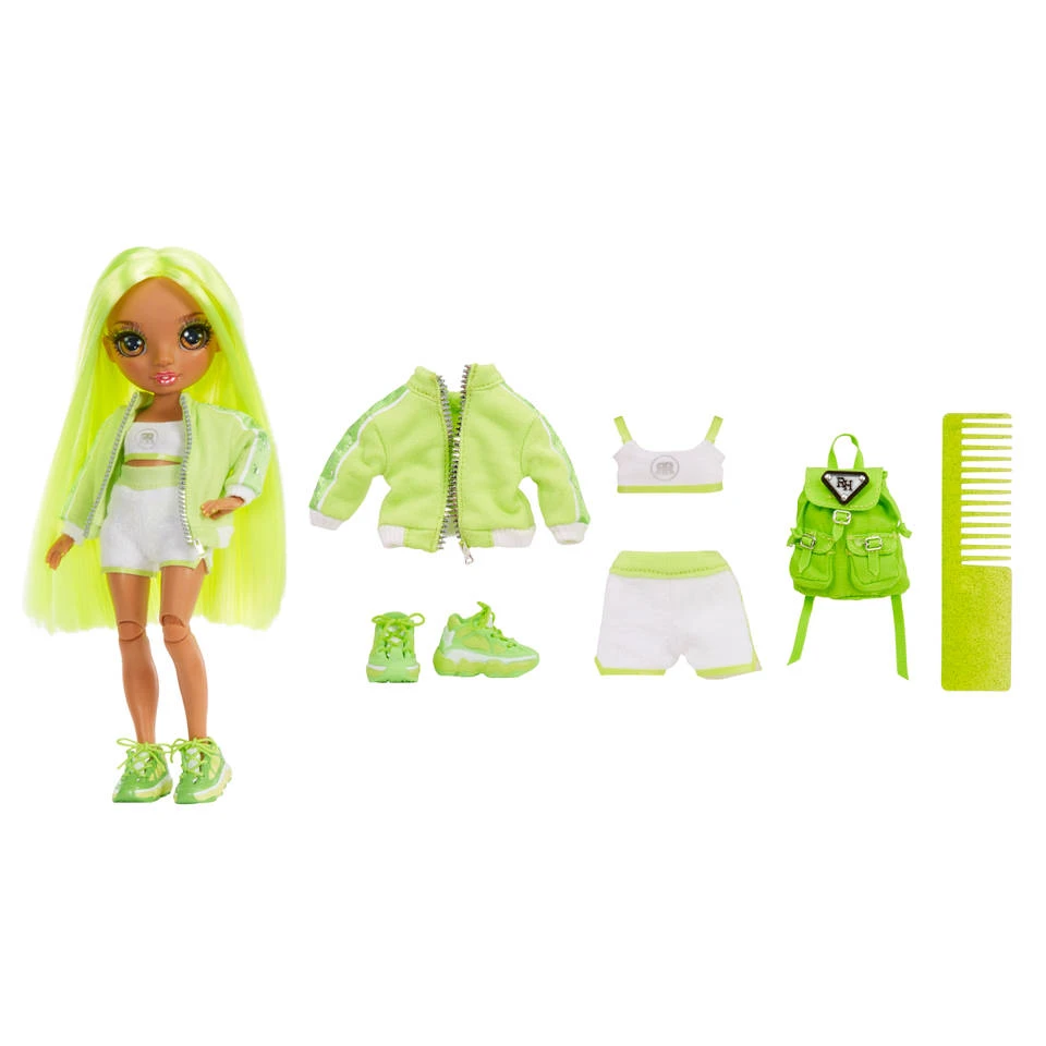 Karma Nichols is van top tot teen gekleed in het NEONGROEN, haar lievelingskleur. Ze heeft een supermooi, jonger gezichtje, mode met prachtige details, schitterend lang, steil, neongroen haar, lange wimpers en glazen ogen. Verzamel een regenboog aan adembenemend mooie Jr. High-modepoppen.