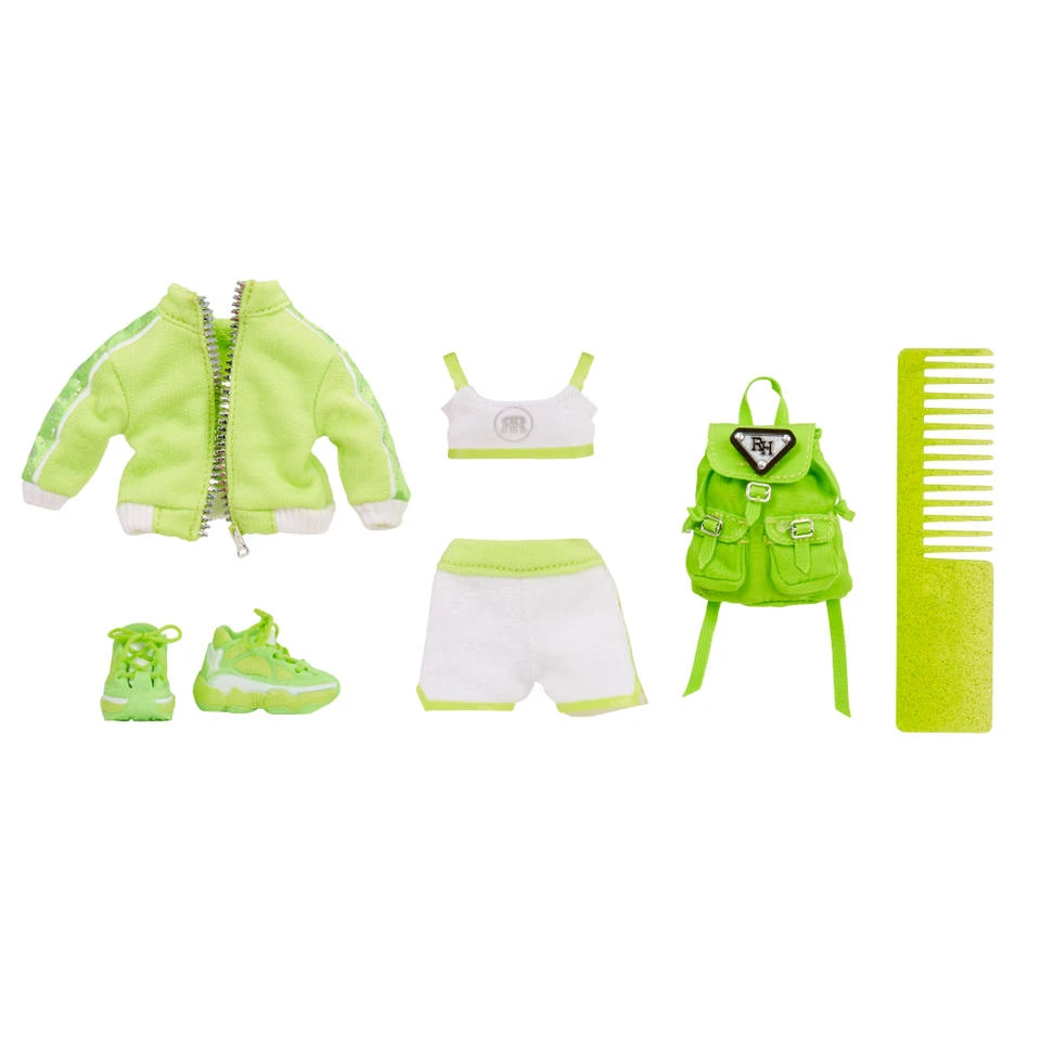 Karma is een ontluikende sociale media-expert en een trendsetter met een uniek standpunt. Ze draagt een wit-groene hoodie en korte broek van badstof, een gebreide top met een zilverkleurige print, bijpassende sneakers en haar spulletjes voor op school. ze wordt vast en zeker een Rainbow High-legende, want haar hele familie heeft er ook op gezeten. Op dit moment besteedt ze al haar vrije tijd aan het opzetten van haar vlog. Om altijd goed voorbereid te zijn, bewaart ze haar spulletjes in de neongroene rugzak die ze overal mee naartoe neemt. Haar rugzak van zachte stof kan open en dicht en is versierd met een RH-logo.