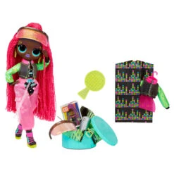 - De set bestaat uit een modepop, complete poppenoutfit, een paar poppenschoenen, poppenaccessoires: naaimachine, make-uppalet, haardroger, mobiel plus hoesje en poppenstandaard.